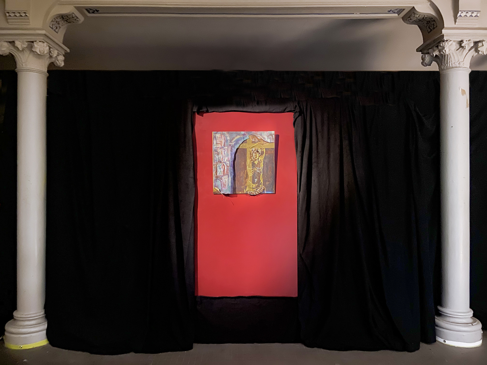 Journal Entry Extract, 20/02/2022: "I noticed there was a small orthodox icon of Saint Sebastian hanging above his bed. It caught my eye, then the strangest thing occurred. It started moving, breathing. Meanwhile, I forgot I had a body. The icon gradually overtook more and more space in my conscience, until it covered his whole bedroom, the entire existing space. And gravity vanished. I was caught in layers of gold. The piece crosses the boundaries between the defined and the blurred, the two- dimensional and material, the spiritual and earthly sphere. It flows into a transcendental experience. The viewer is invited to come in direct physical and intimate contact with the iconographical work by lifting the canvas and thus enter its layers."
