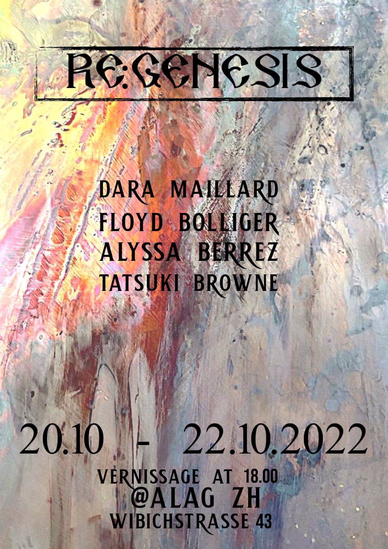 RE:GENESIS is a self-organized exhibition by young artists currently studying at the Zurich University of the Arts. The project originated from an interest towards the exhibition space ALAG, a former protestant church in Wipkingen, now used as an uncommercial open space. The space has once been used as a gathering and organizational space for the Klimastreik, amongst others. Thus, it gained the nickname of Klimakirche. The exhibition engages with the building and its history and seeks to explore the historical impact which Christianity has had on contemporary Ideology and values. The Old Testament is recontextualized and reframed to fit modern understandings and questionings.